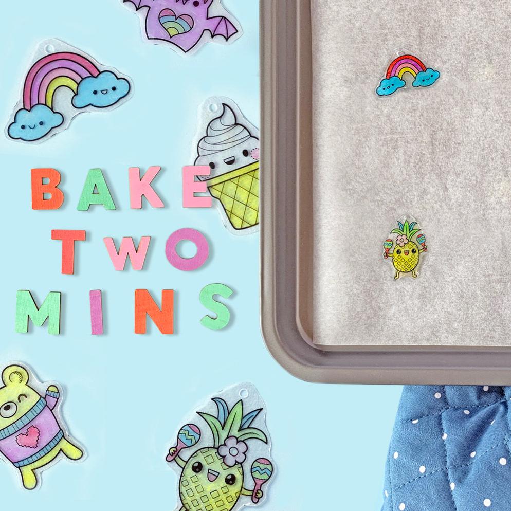 - Bake in the oven for 2 minutes — Shrinkies will curl up as they shrink before flattening out again.