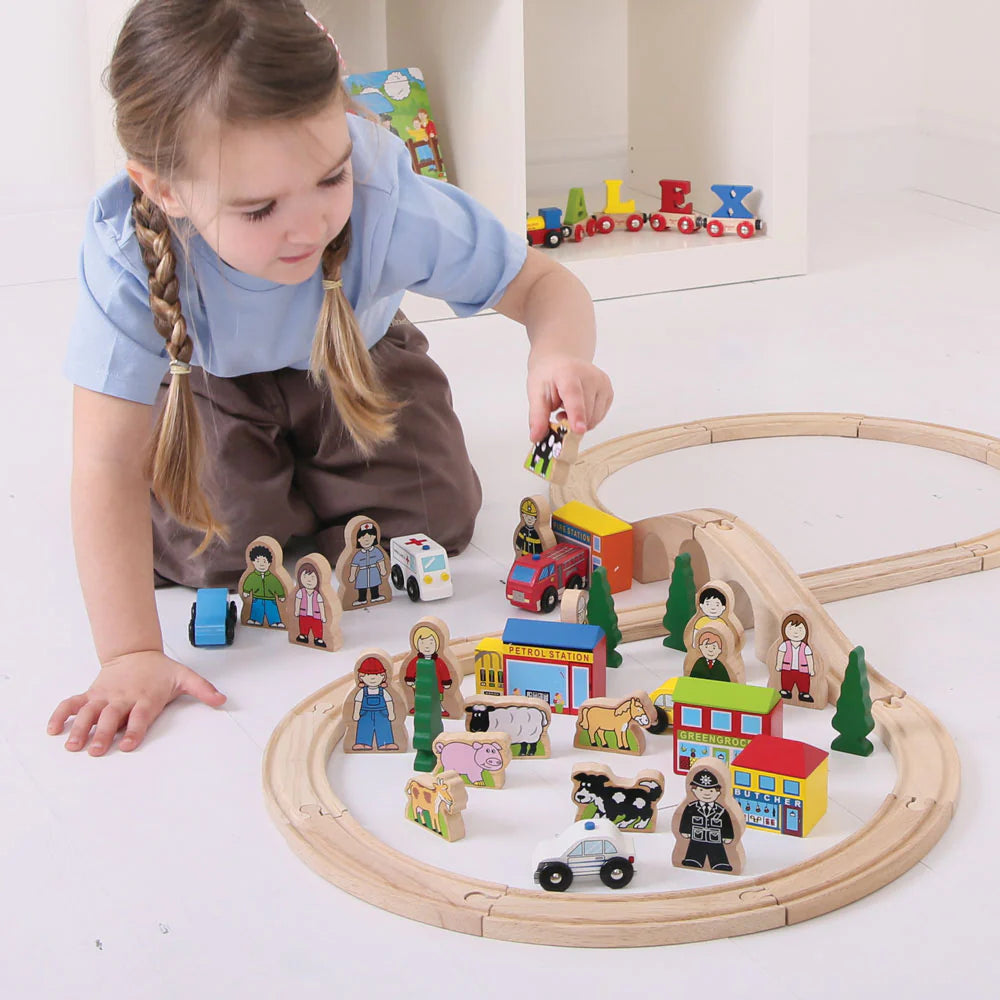 Workers, shoppers, farm animals, vehicles, houses and trees are all part of the backdrop that'll engage bright young minds for hours at a time.