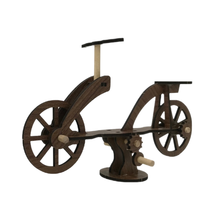 The Leonardo da Vinci Bicycle Miniature is a working re-creation of his 15th Century design The incredible bicycle image was discovered hidden in the Codex of Atlanticus folio of Leonardo’s drawings and writings. It is regarded by scholars as a drawing by one of his students, likely based on lost drawing by Leonardo. It is a testimony to his inventiveness that he designed a bicycle 300 years before anyone was even thinking of self-propelled two-wheel transport!