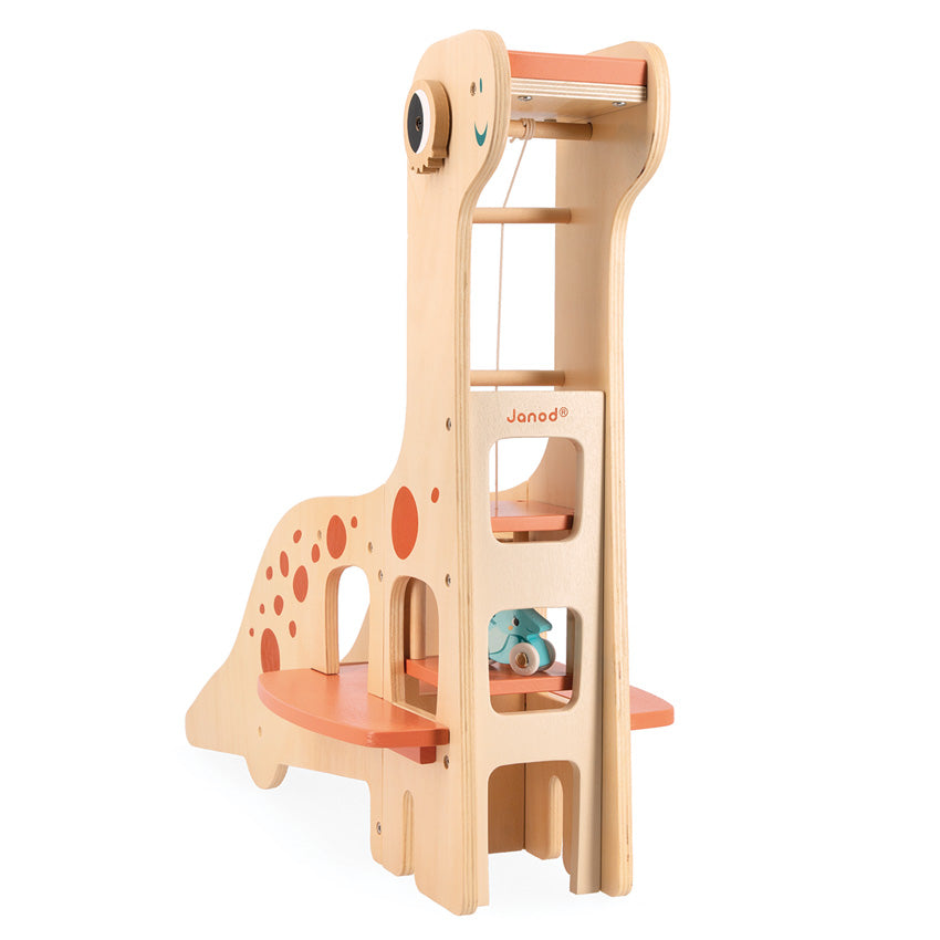 With this FSC wooden garage and dinosaur set, your child can use the 4 rolling dinosaurs to go off and explore, then bring them back to the garage to park and rest. The garage is equipped with a lift allowing direct access to the first and second floors. To get back down either use the internal ramp to slide them down, or the internal lift.