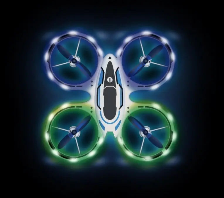 Introducing the Neon Stunt, 3-channel 2.4GHz transmission drone that takes your aerial adventures to new heights. Equipped with vibrant blue and green LED lights, this drone adds a mesmerizing light show to your flights, whether day or night.