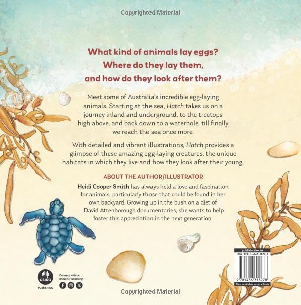 Hatch takes readers on a fascinating journey through Australia's diverse landscapes, from the sea to underground burrows, treetops, and waterholes, revealing the incredible egg-laying creatures that inhabit these unique environments. With vivid, detailed illustrations, this book offers an insight into the lives of these extraordinary animals, showcasing their distinct habitats and the remarkable ways they nurture and protect their eggs and young. A delightful exploration of nature’s wonders!