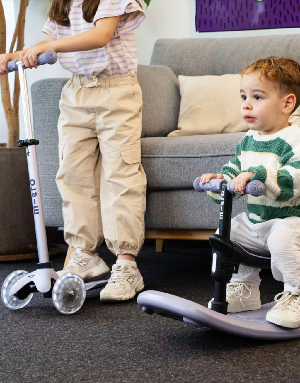 The Mini Micro Rock & Go is one product with six stages and the world's first rocking scooter, designed to grow with your child without the hassle of tools. The seat clips on and off in seconds, making it easy to switch between modes, and it’s perfect for sharing; one can rock while the other scoots, ideal for siblings close in age.