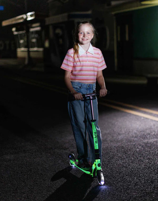 The Micro Sprite Intercosmic cleverly stores daylight throughout the day, then releases a mesmerising glow as night falls. Combined with self-powered LED wheels, it keeps your child visible and safe while giving them that “just five more minutes” magic.