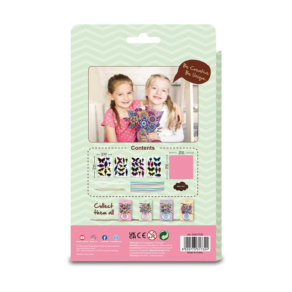 A fun scratch activity kit for kids to make beautiful, butterfly-themed bouquets.