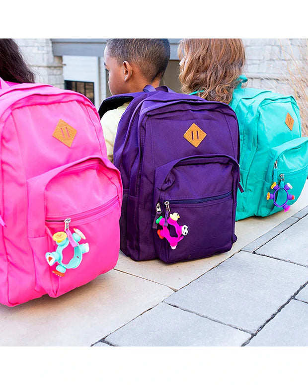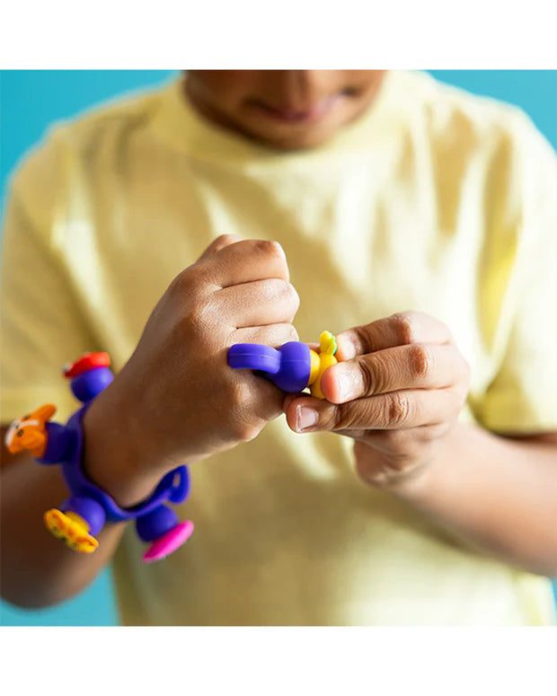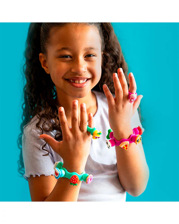 Pick your favorite charms and fit them into the sockets of the silicone bracelet and ring. It's a playful way to accessorize - on your wrists and fingers or even on a backpack - and when you pull them out, they make the most satisfying "POP!" Each set comes with a bracelet, a ring, and eight unique charms.