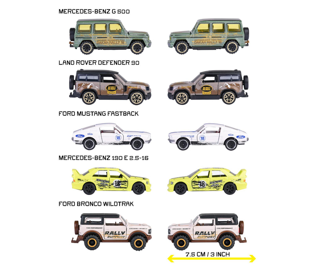 Untamed vehicle set - 5 characterful model cars: 1. Ford Mustang Fastback, 2. Ford Bronco Wildtrak, 3. Land Rover Defender 90, 4. Mercedes-Benz 190 E 2.5-16 EVO II, and 5. Mercedes-Benz G 500.