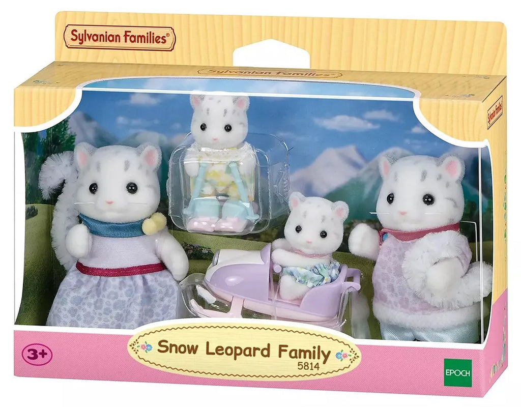 The Snow Leopard family have fluffy, white fur and long tails. This set comes with mother, father, babies in matching rompers and accessories. The figures are dressed in light-coloured, leopard print clothes. The babies can ride the baby snowmobile and go skiing.