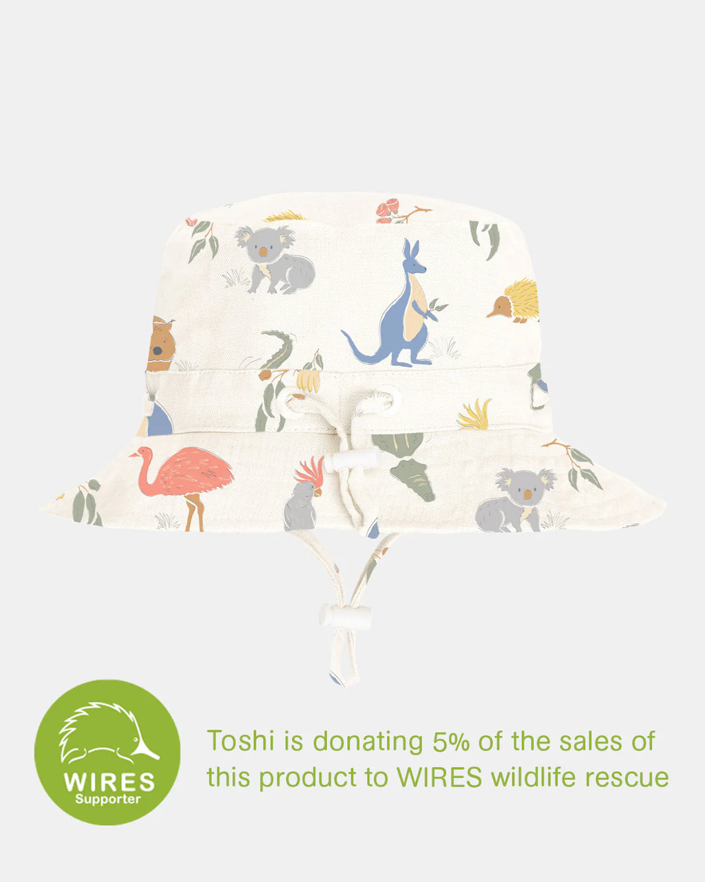 Toshi presents the classic Sunhat Odyssey, ideal for children of all ages. Our sunhat has a broad and well-structured brim offers maximised sun protection. A UPF 50+ UV rating is provided for Snapper & UPF 30+ UV rating for Sunset Island. A head tie creates adjustable sizing and the chin tie with toggle secures the hat for ease of wear. The security release clasp on the chin tie is designed to enhance wearer safety. The classic Toshi Sunhat is crafted from the finest quality 100% cotton and is fully lined for additional comfort. An original and exclusive Toshi print design is featured.